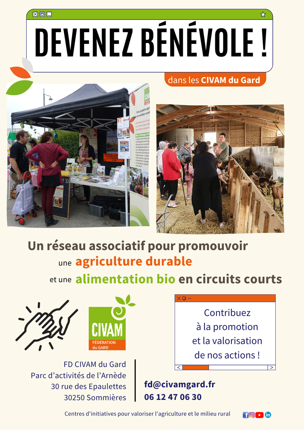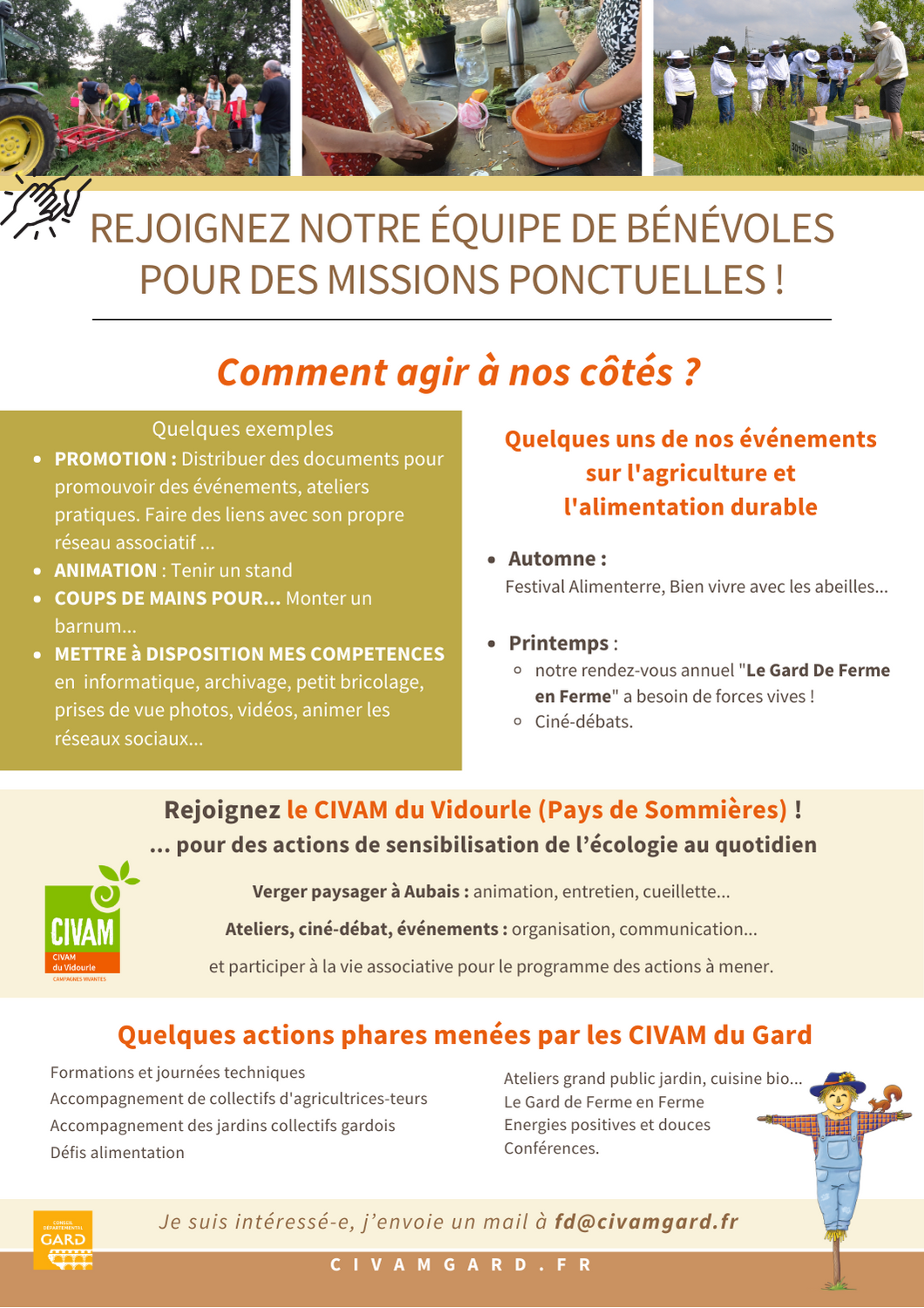 En adhérant à la FD CIVAM du Gard, vous soutenez une association locale qui oeuvre pour valoriser une agriculture bio et locale nourricière, contribuer à promouvoir l'agroécologie dans son territoire, contribuer à appuyer le développement de l'agriculture biologique et qui fait le lien entre Agriculture et Société.Adhésion Agriculteurs / Porteurs de projet