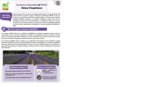 Depuis plusieurs années on observe une véritable augmentation du nombre de fermes et de surfaces cultivées en plantes à parfum aromatiques et médicinales (PPAM). De plus, de nombreux.ses producteur.ices de PPAM souhaitent intégrer une démarche de commerce équitable Nord/Nord. Cependant, il est parfois compliqué de savoir quels sont les avantages/inconvénients d?une telle labellisation ou les différentes étapes pour se lancer.