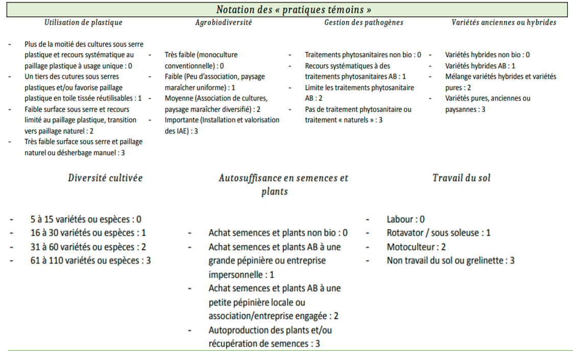 Les pratiques témoins sont des pratiques culturales définies dans cette étude comme étant « agroécologiques » et illustrant une certaine sensibilité environnementale. Elles sont présentées dans la figure suivante.